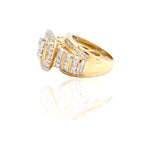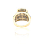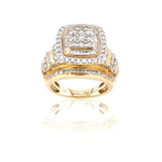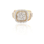 This striking 10K yellow gold diamond ring features a bold square cluster centerpiece designed to maximize brilliance and presence. The center is composed of a tightly set diamond cluster, framed by a double halo of sparkling round and baguette-cut diamonds that enhance depth and dimension.